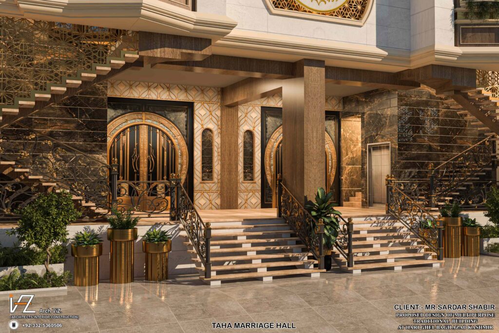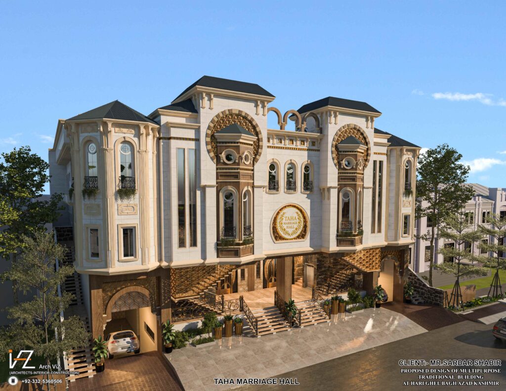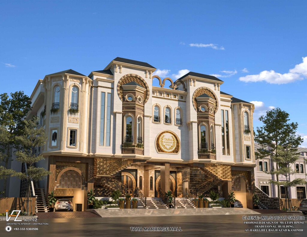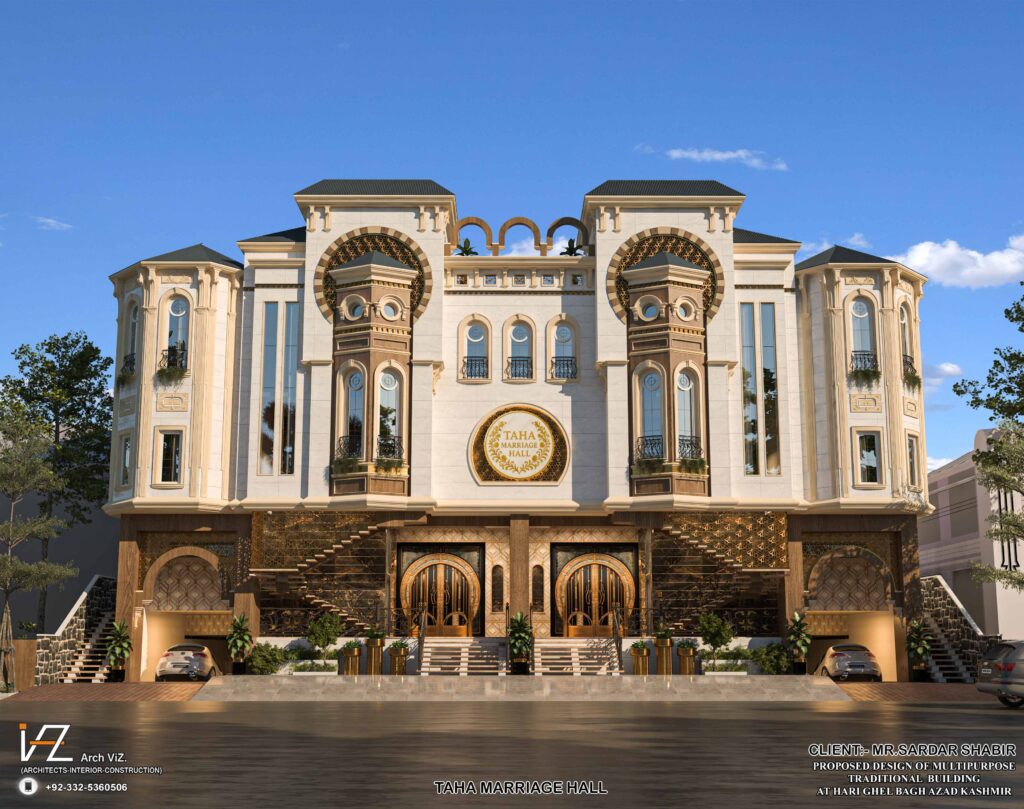 “A grand traditional-style multipurpose hall located in Bagh, Azad Kashmir, featuring rich cultural detailing, arched windows, ornate columns, and golden decorative elements. The symmetrical façade, corner towers, and elevated entrance showcase a fusion of regional traditional aesthetics with modern elegance.”