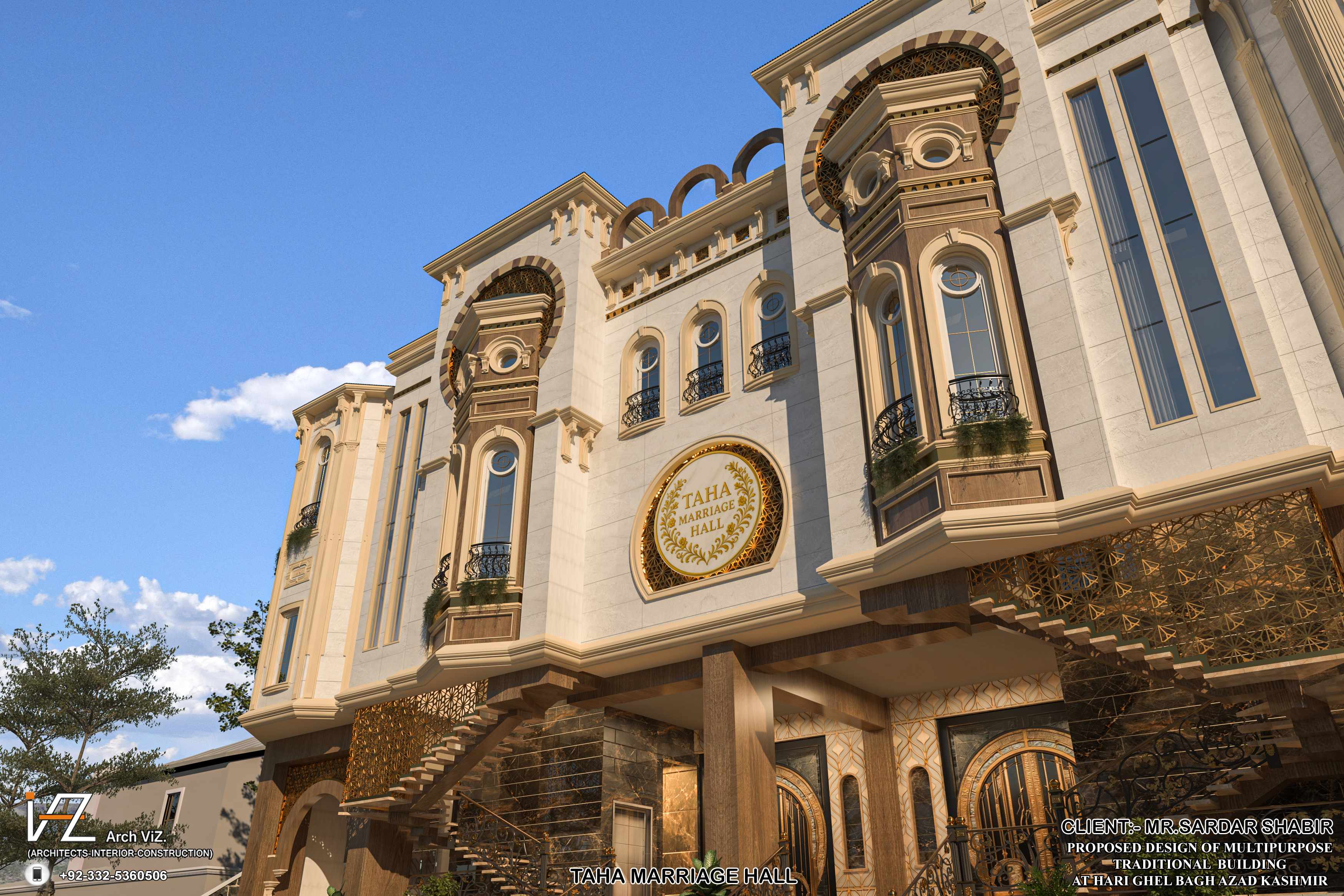 “A grand traditional-style multipurpose hall located in Bagh, Azad Kashmir, featuring rich cultural detailing, arched windows, ornate columns, and golden decorative elements. The symmetrical façade, corner towers, and elevated entrance showcase a fusion of regional traditional aesthetics with modern elegance.”